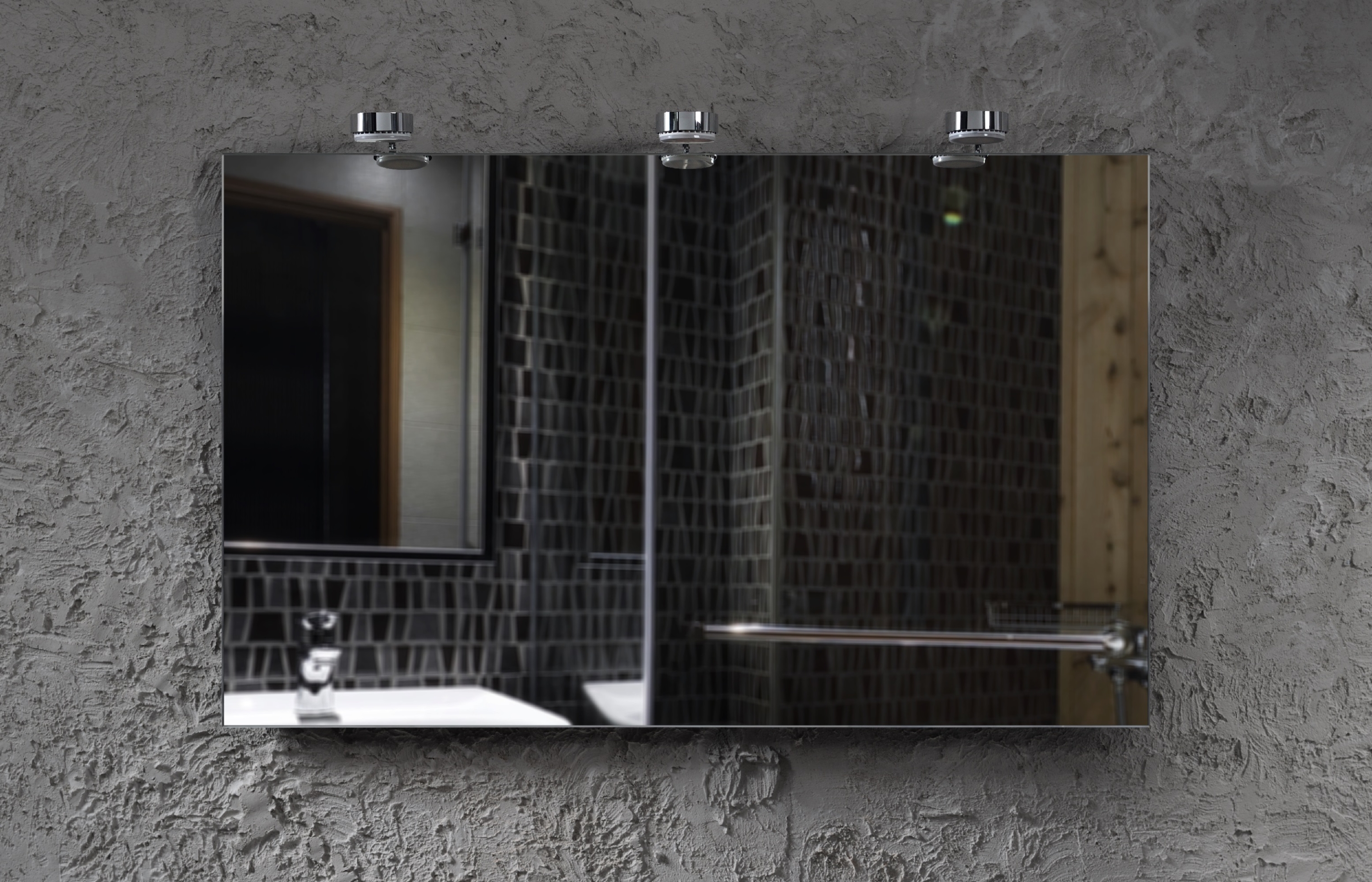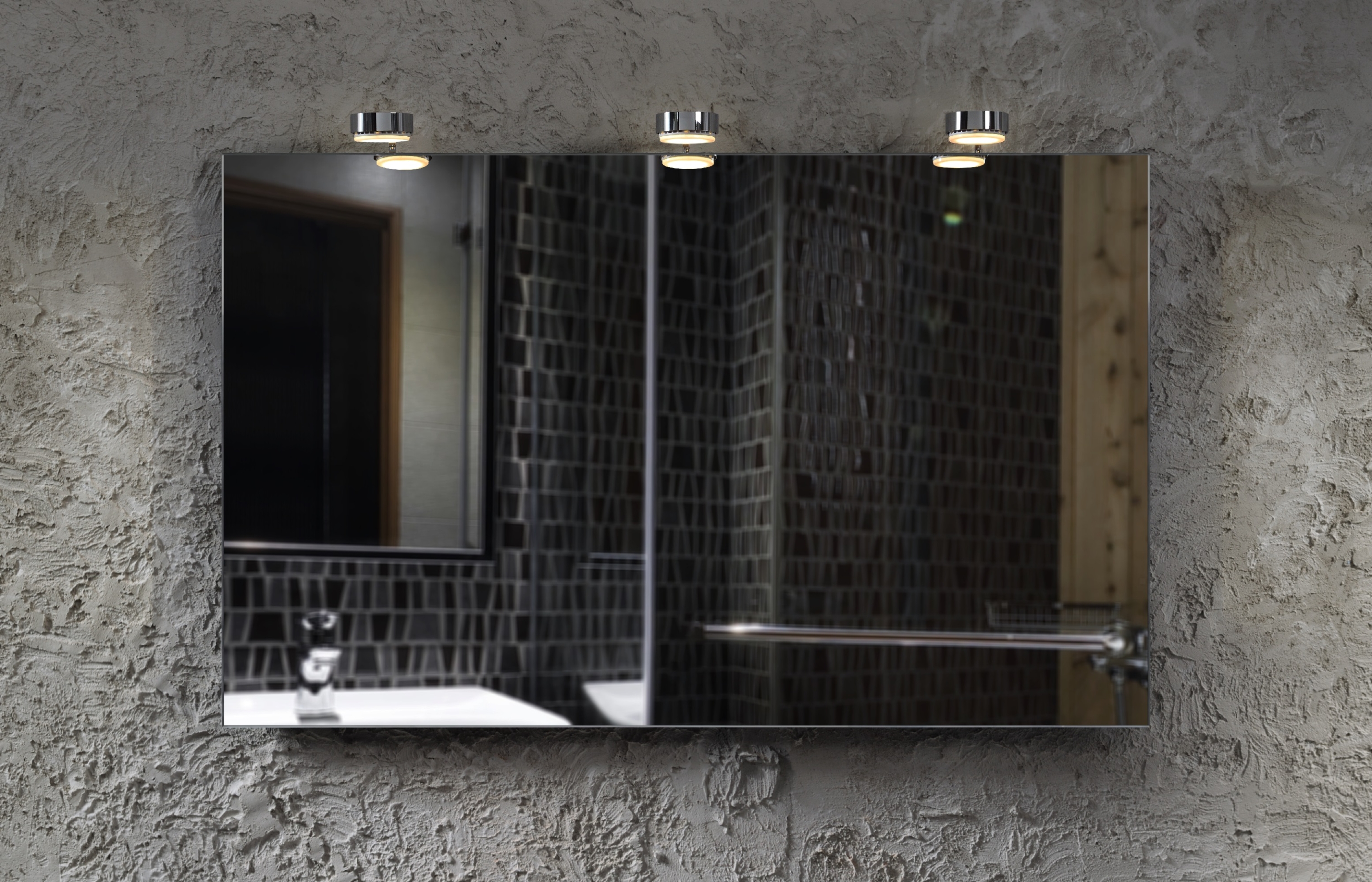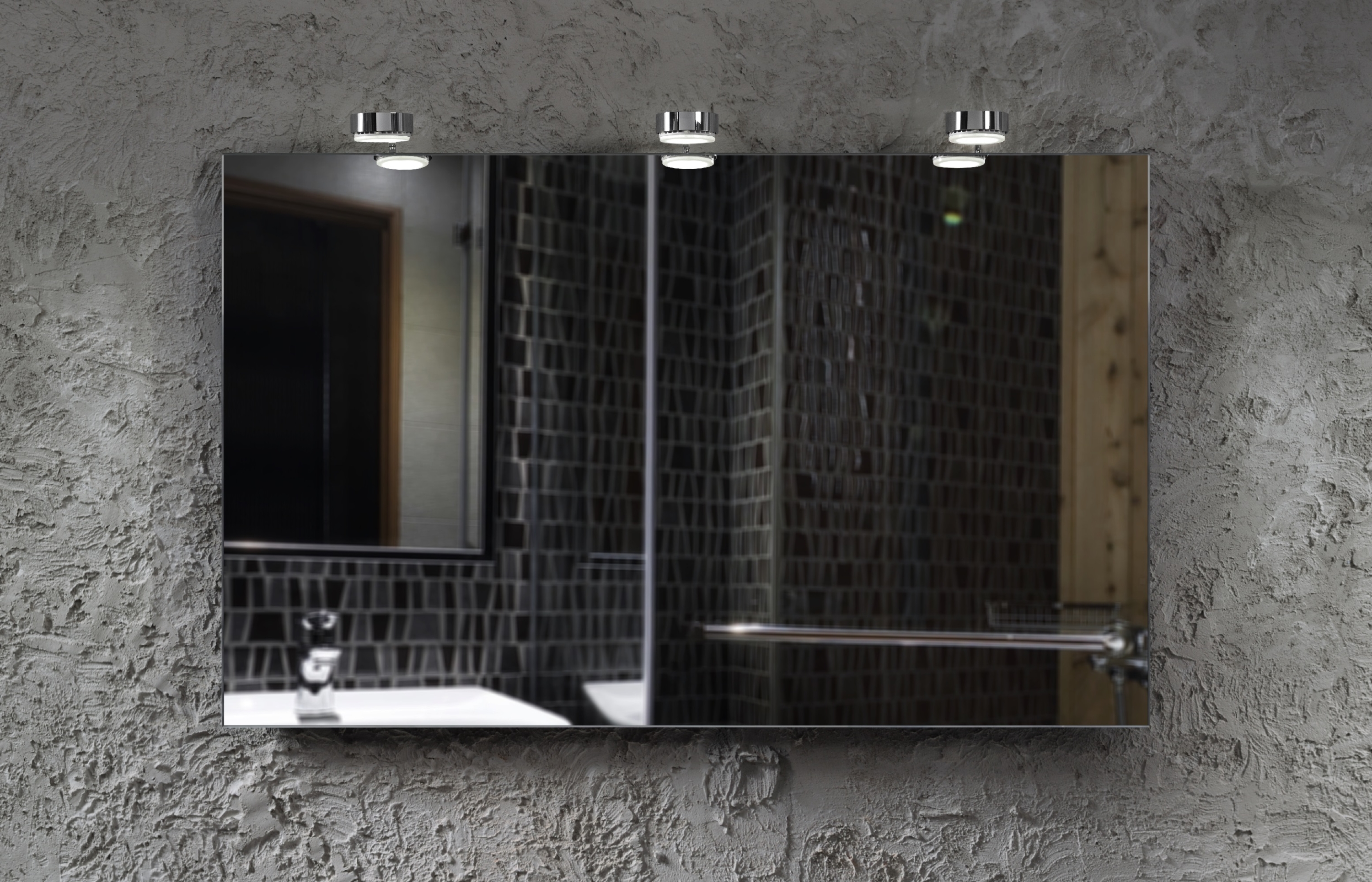 Drei Designer Lampen mit energiesparender LED-Technik und aus edelem Chrom verleihen dem Spiegel einen modern-zeitlosen Charakter.