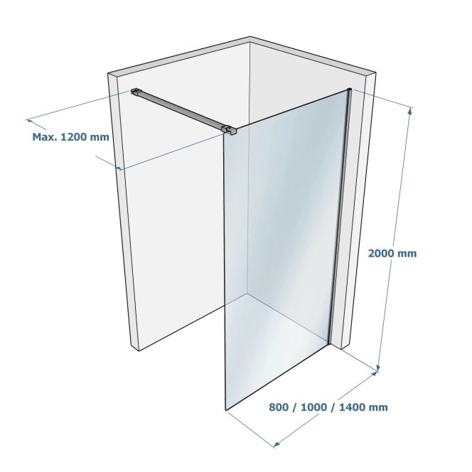 • Gesamtbreite (Glas + Wandprofil) 80 cm, 100 cm oder 140 cm