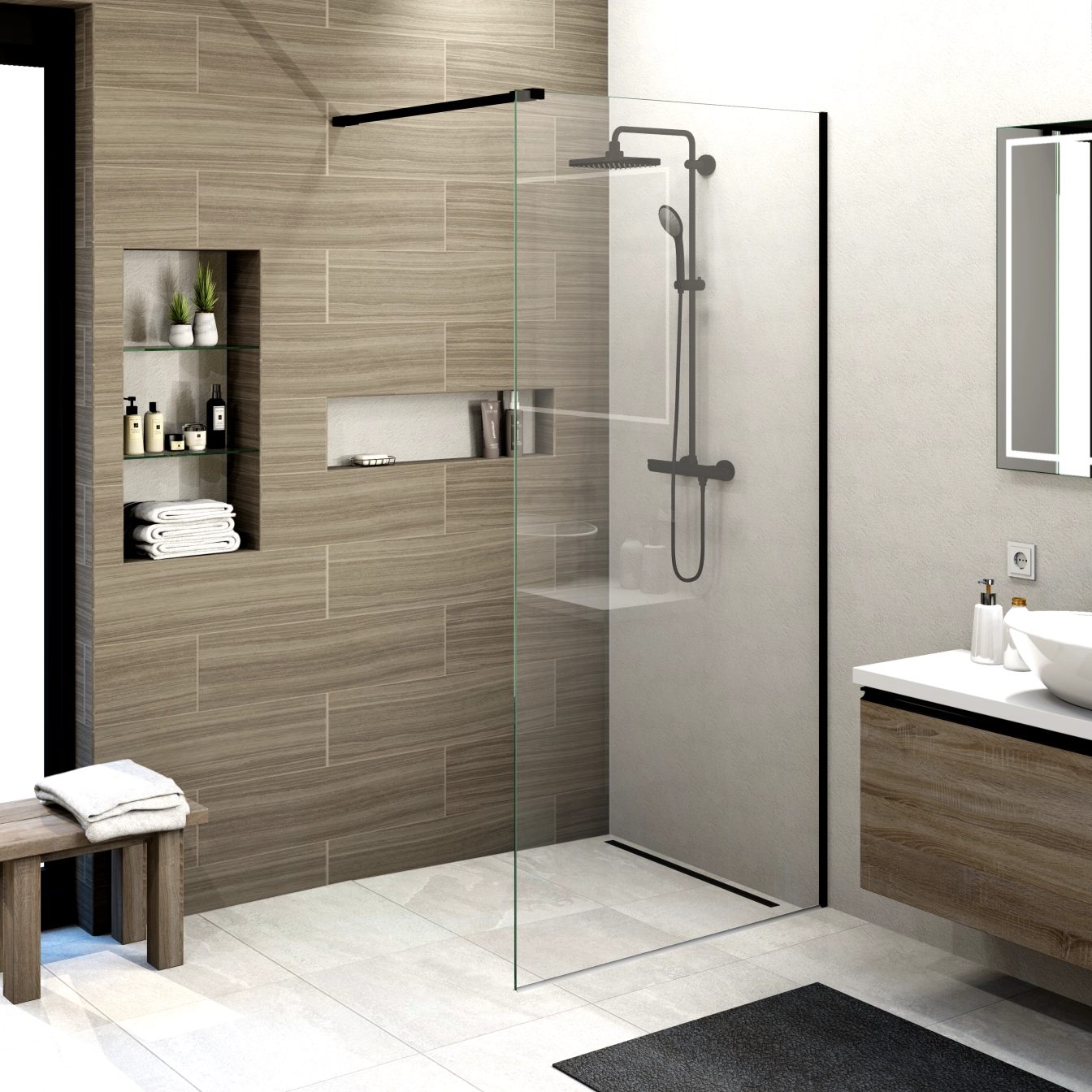 Duschwand aus robustem 8 mm starkem Sicherheitsglas mit hochwertiger TIMELESS-Beschichtung und schwarzen Beschlägen.