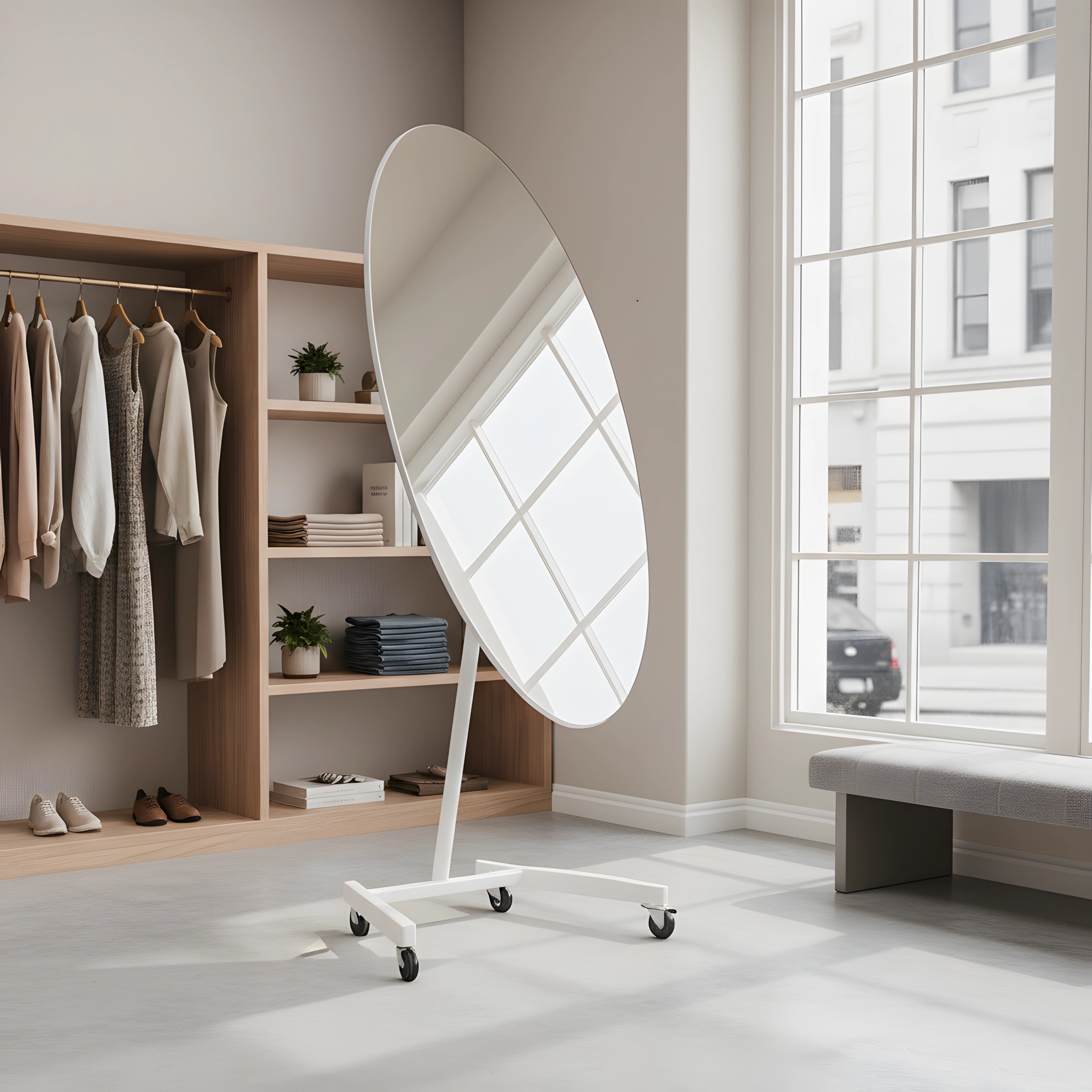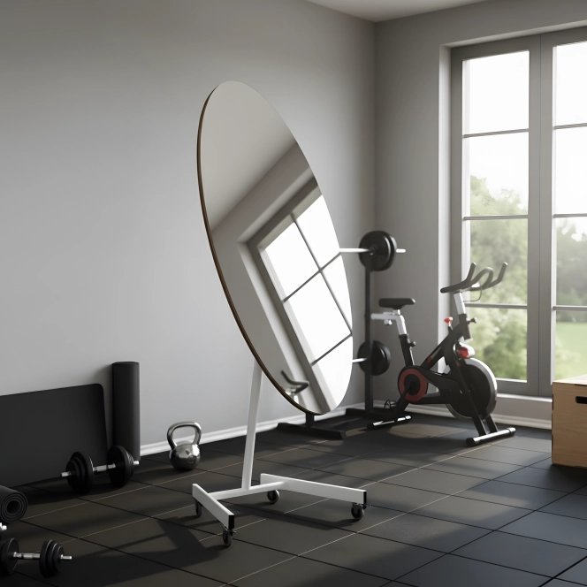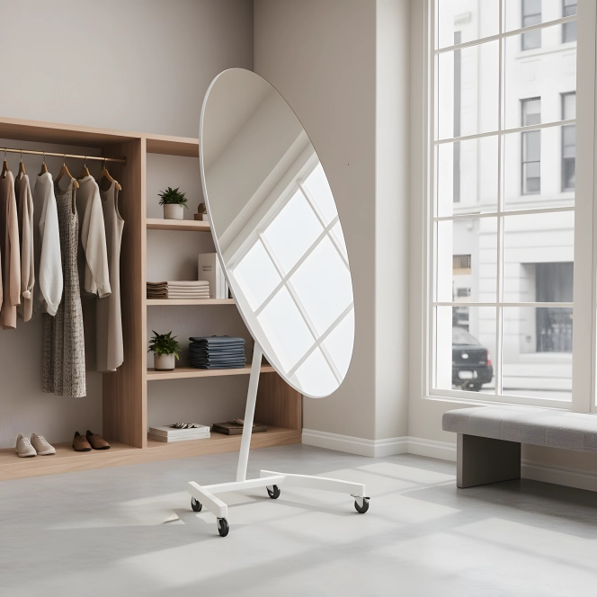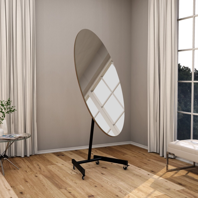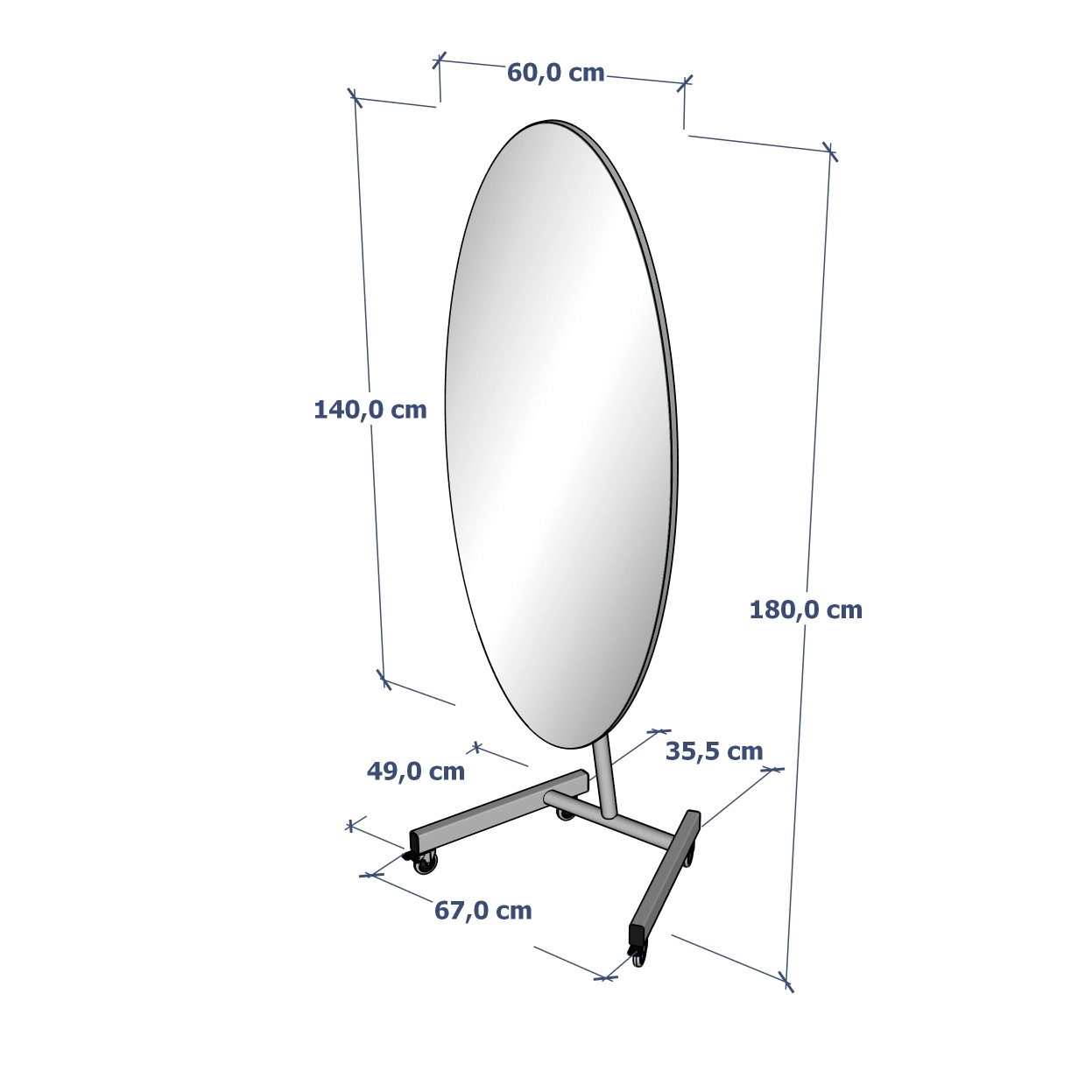 Praktisch, mobil und vielseitig – unser rollbarer Kippspiegel ist die ideale Lösung für Verkaufsräume, Studios, Umkleiden oder Therapieräume. Dank stabiler Konstruktion und leichtgängigen Rollen lässt er sich flexibel bewegen und sicher positionieren. Der Spiegel ist in rechteckiger oder ovaler Form erhältlich und überzeugt durch eine großzügige Spiegelfläche (140 cm Höhe) für eine optimale Ganzkörperansicht. Perfekt für professionelle Einsätze, langlebig und sofort einsatzbereit.