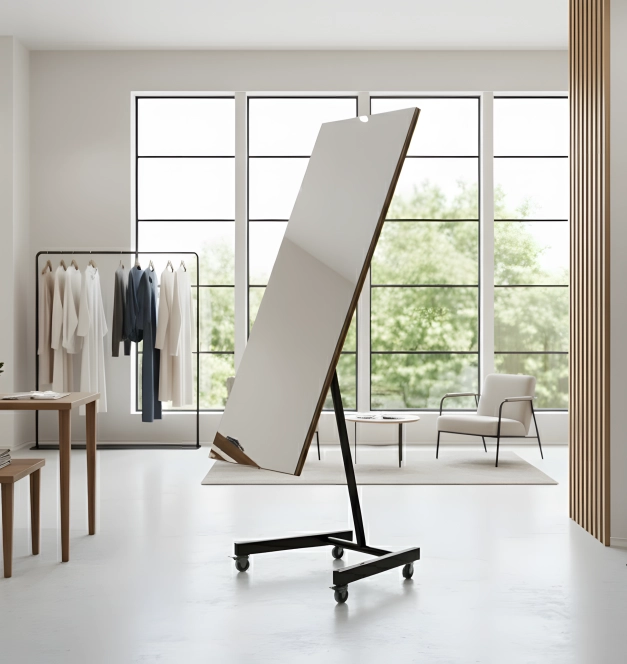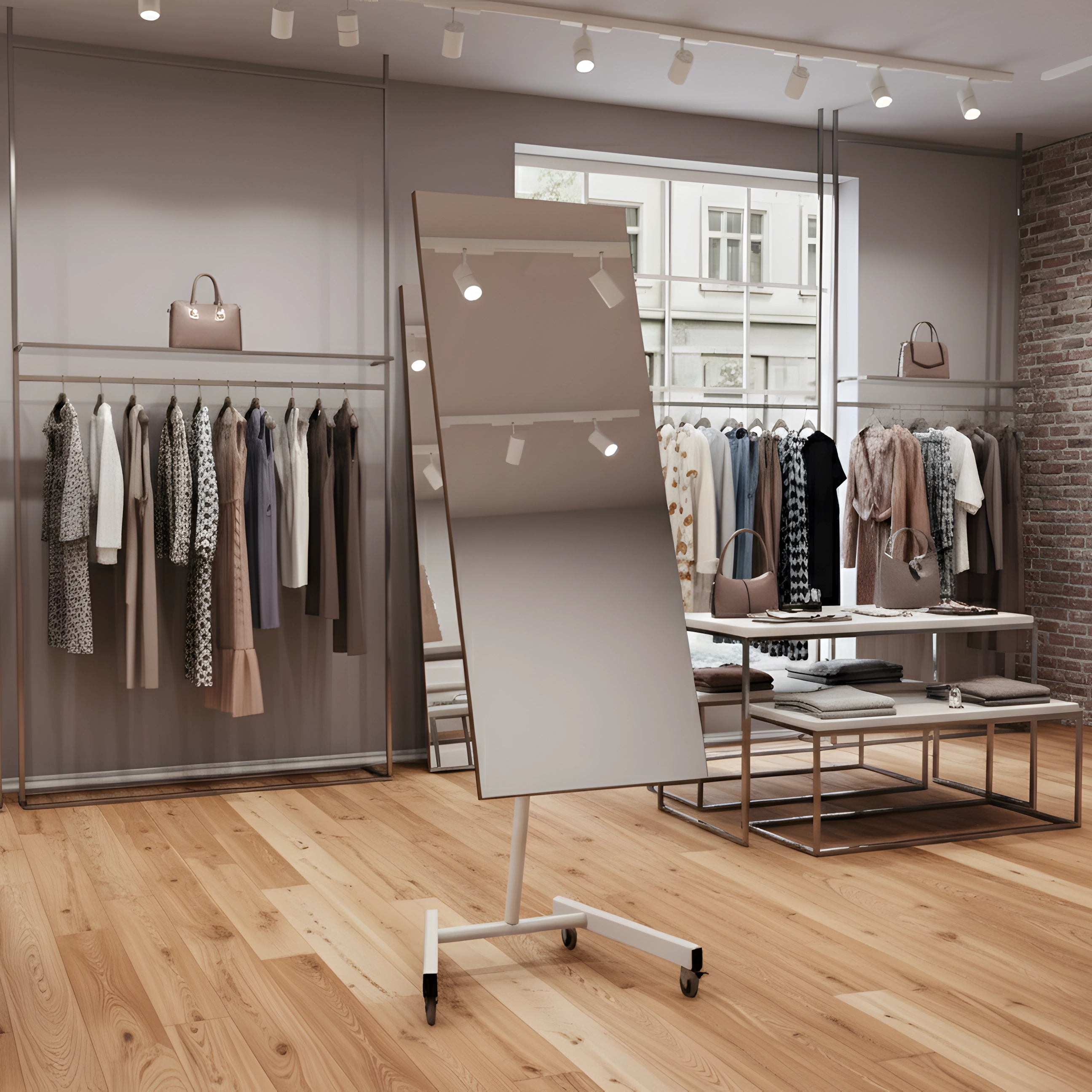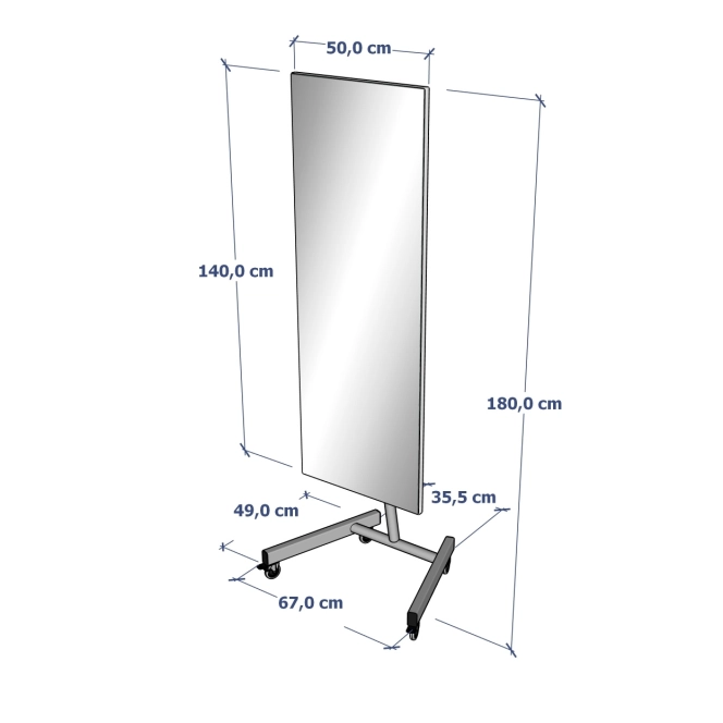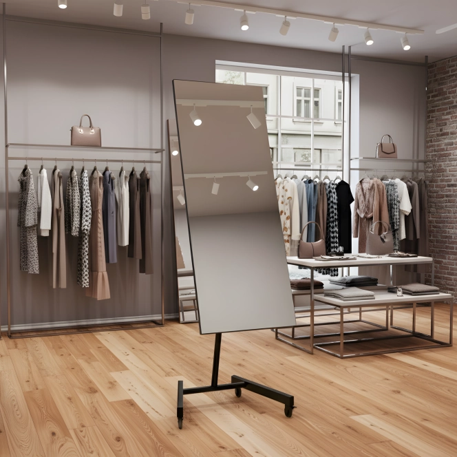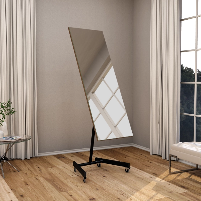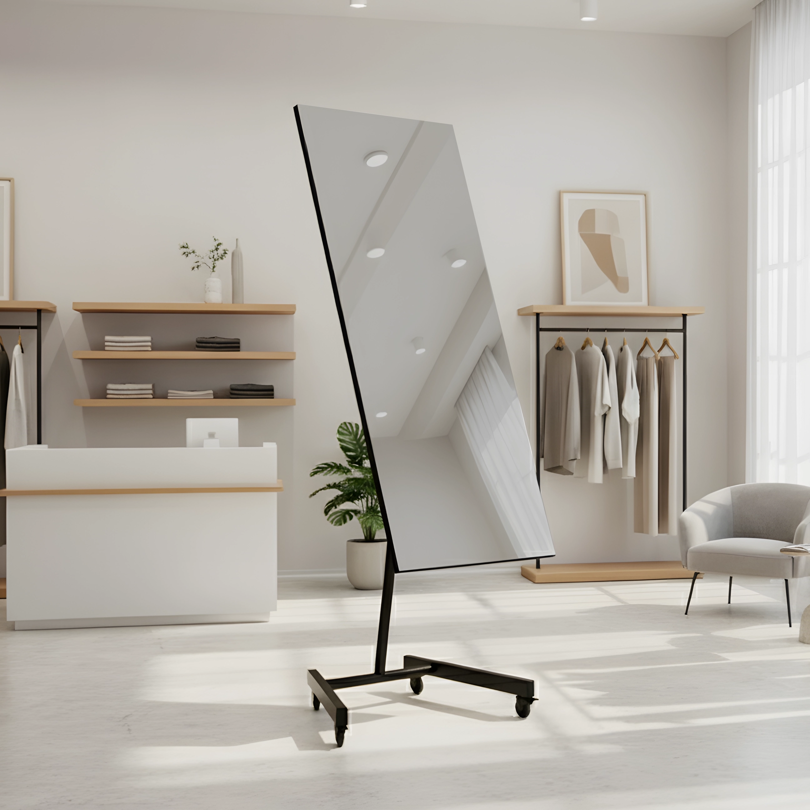 Praktisch, mobil und vielseitig – unser rollbarer Kippspiegel ist die ideale Lösung für Verkaufsräume, Studios, Umkleiden oder Therapieräume. Dank stabiler Konstruktion und leichtgängigen Rollen lässt er sich flexibel bewegen und sicher positionieren. Der Spiegel ist in rechteckiger oder ovaler Form erhältlich und überzeugt durch eine großzügige Spiegelfläche (140 cm Höhe) für eine optimale Ganzkörperansicht. Perfekt für professionelle Einsätze, langlebig und sofort einsatzbereit.